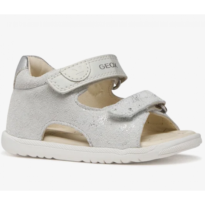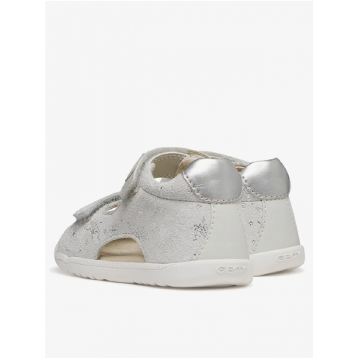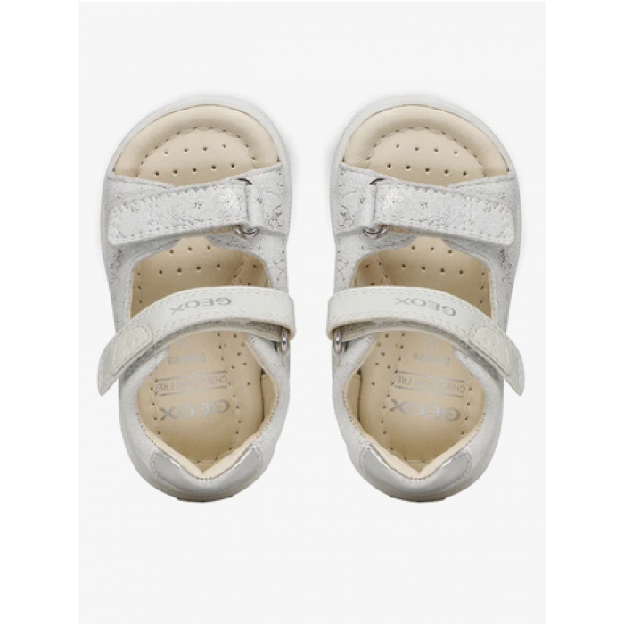 Παιδικά δερμάτινα πέδιλα Geox σε λευκό χρώμα με ασημένιες λεπτομέρειες. Διαθέτει