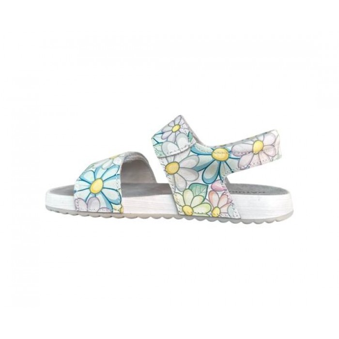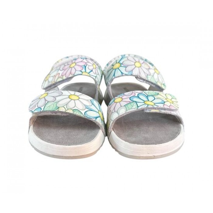 Ανατομικά , δερμάτινα πέδιλα της NATURINO σε λευκό χρώμα και πολύχρωμες μαργαρίτες .